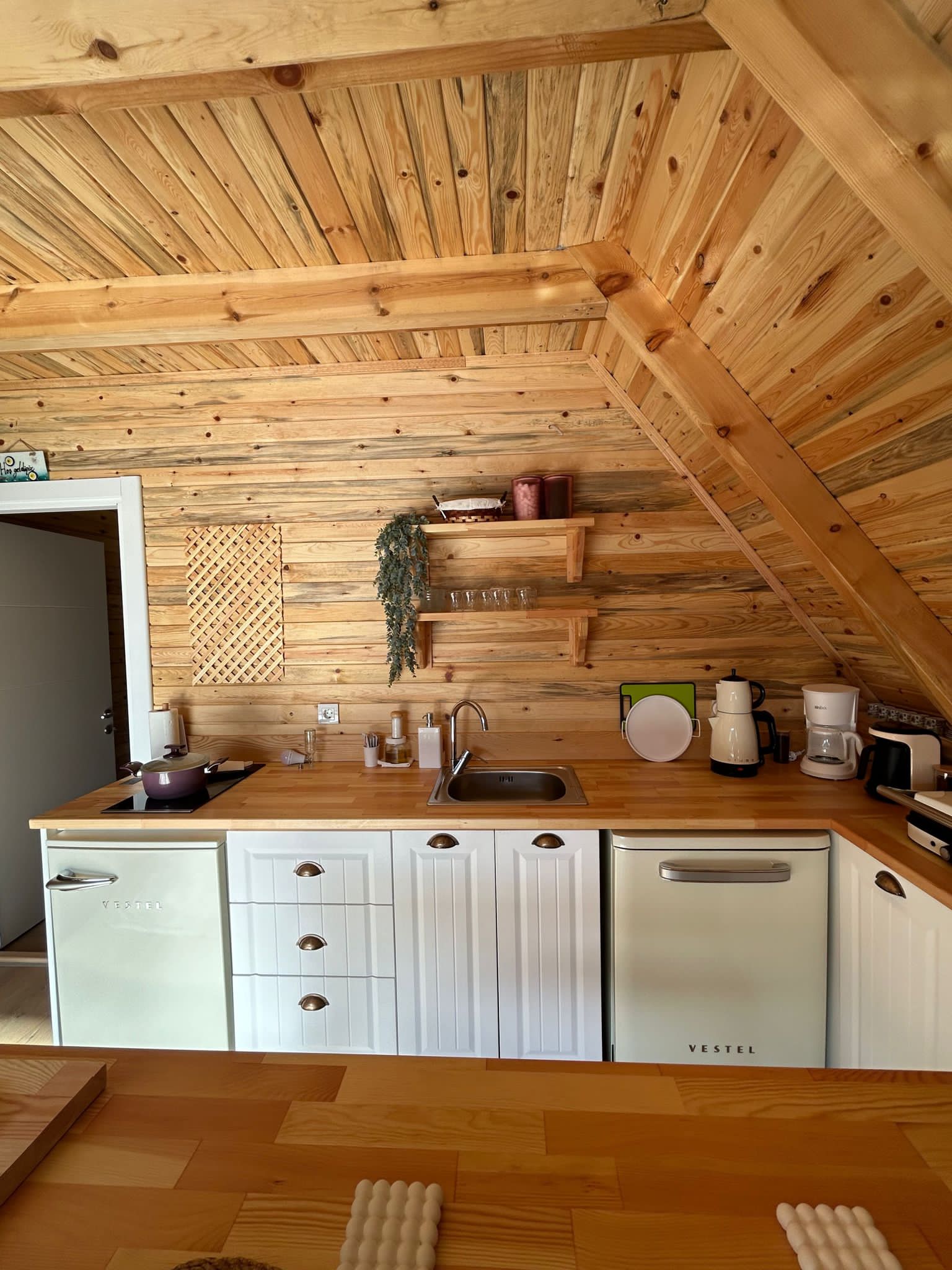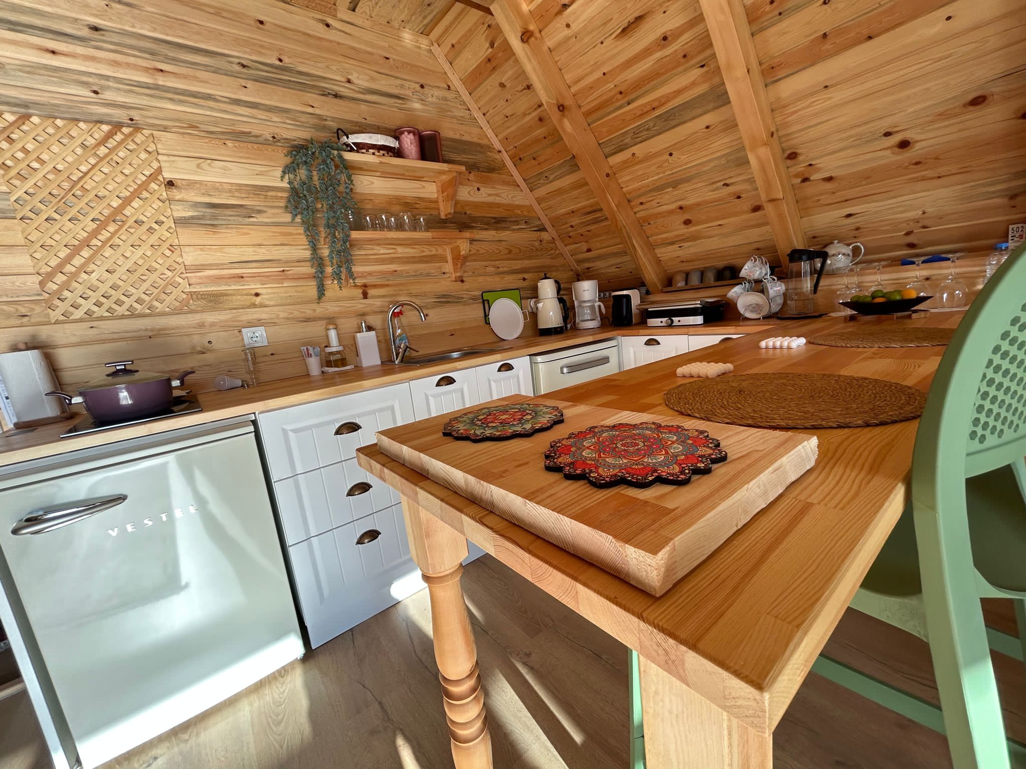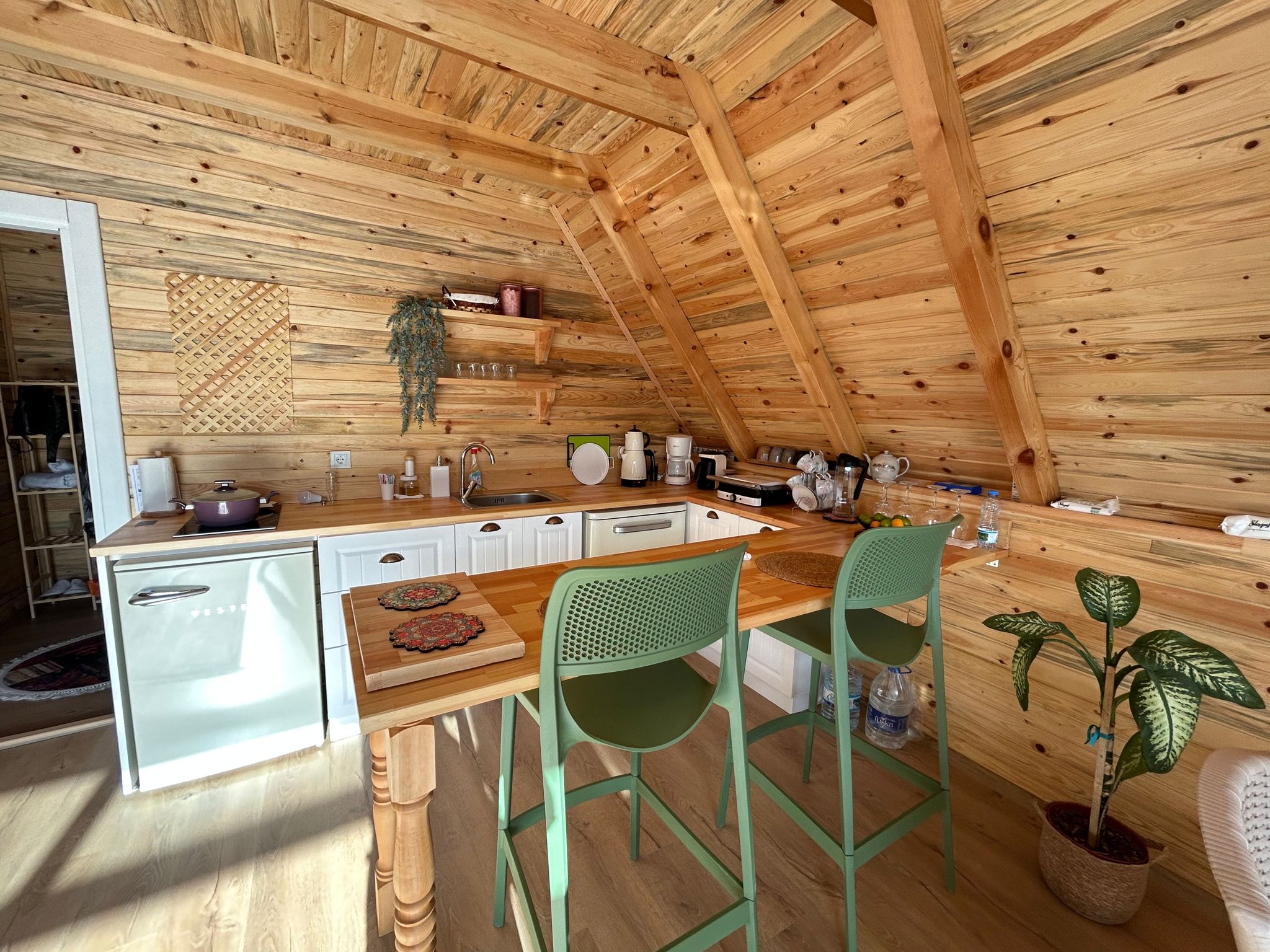 🔪Mutfak içerisinde çaycı, kahve cezvesi, ocak, buzdolabı, mutfak araç̧ gereçleri, bahçede ızgara